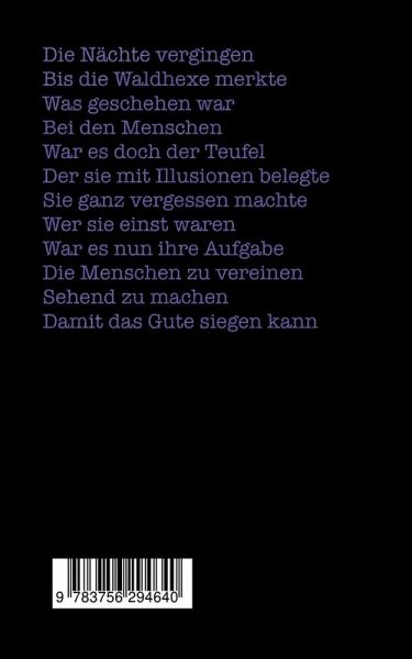 Die Nächte vergingenBis die Waldhexe merkteWas geschehen warBei den MenschenWar es doch der TeufelDer sie mit Illusionen belegteSie ganz vergessen machteWer sie einst waren War es nun ihre AufgabeDie Menschen zu vereinenSehend zu machen Damit das Gute siegen kann