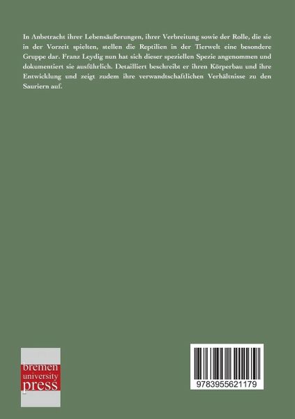 In Anbetracht ihrer Lebensäußerungen, ihrer Verbreitung sowie der Rolle, die sie in der Vorzeit spielten, stellen die Reptilien in der Tierwelt eine besondere Gruppe dar. Franz Leydig nun hat sich dieser speziellen Spezie angenommen und dokumentiert sie ausführlich. Detailliert beschreibt er ihren Körperbau und ihre Entwicklung und zeigt zudem ihre verwandtschaftlichen Verhältnisse zu den Sauriern auf.