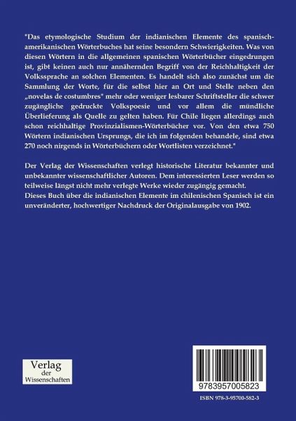 Dieses Buch über die indianischen Elemente im chilenischen Spanisch ist ein unveränderter, hochwertiger Nachdruck der Originalausgabe von 1902.