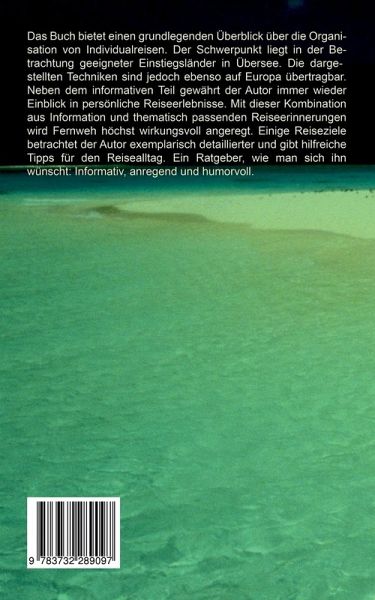 Das Buch bietet einen grundlegenden Überblick über die Organisation von Individualreisen. Der Schwerpunkt liegt in der Betrachtung geeigneter Einstiegsländer in Übersee. Die dargestellten Techniken sind jedoch genauso auf Europa übertragbar. Neben dem informativen Teil gewährt der Autor immer wieder Einblick in persönliche Reiseerlebnisse. Mit dieser Kombination aus Information und thematisch passenden Reiseerinnerungen, wird Fernweh höchst wirkungs- und humorvoll angeregt. Einige Reiseziele betrachtet der Autor exemplarisch detailliert und gibt hilfreiche Tipps für den Reisealltag. Ein Ratgeber wie man sich ihn wünscht: Informativ, anregend und humorvoll.