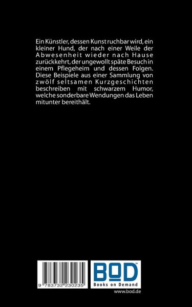 Ein Künstler, dessen Kunst ruchbar wird, ein kleiner Hund, der nach einer Zeit der Abwesenheit wieder nach Hause zurückkehrt, der ungewollt späte Besuch in einem Pflegeheim und dessen Folgen. Diese Beispiele aus einer Sammlung von seltsamen Kurzgeschichten beschreiben mit schwarzem Humor, welche sonderbare Wendungen das Leben mitunter bereithält.