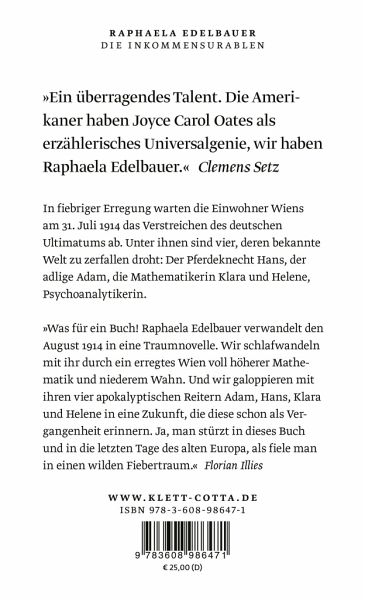 »Was für ein Buch! Raphaela Edelbauer verwandelt den August 1914 in eine Traumnovelle. Wir schlafwandeln mit ihr durch ein erregtes Wien voll höherer Mathematik und niederem Wahn. Und wir galoppieren mit ihren vier apokalyptischen Reitern Adam, Hans, Klara und Helene in eine Zukunft, die diese schon als Vergangenheit erinnern. Ja, man stürzt in dieses Buch und in die letzten Tage des alten Europa, als fiele man in einen wilden Fiebertraum.« Florian Illies
