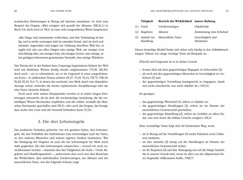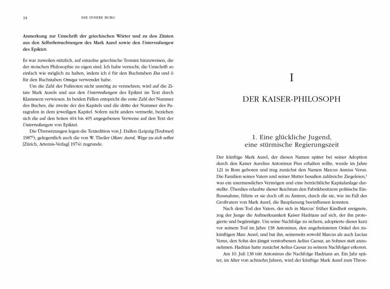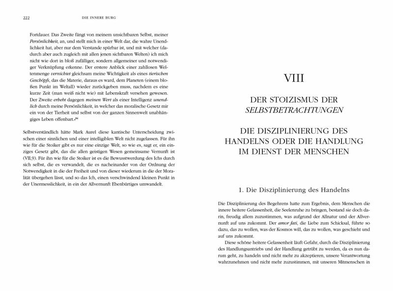 Die Selbstbetrachtungen Mark Aurels werden heute - wie schon seit Jahrhunderten - als eine unerschöpfliche Quelle der Weisheit geschätzt. Sie sind eine der wichtigsten Ausdrucksformen des Stoizismus und damit ein unverzichtbarer Text für jeden, der sich für die antike Philosophie interessiert. Pierre Hadot, ein herausragender Kenner des antiken Denkens, lehrte als Professor für Philosophie am berühmten Collège de France in Paris. Er hat hier ein Standardwerk geschaffen - nicht nur zum Verständnis von Leben und Werk Mark Aurels, sondern auch der stoischen Philosophie allgemein. Daher kann diese Einführung in die Selbstbetrachtungen auch als eine Einführung in den antiken Stoizismus gelesen werden. Pierre Hadots Buch ist eine fesselnde Studie des Philosophenkaisers. Zudem vermittelt es ein umfassendes Verständnis der Tradition und der Lehren des Stoizismus und gibt einen verständlichen Einblick in die Kultur des römischen Reiches im zweiten Jahrhundert.