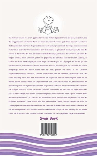 Die Insel der Druiden Anglesey, ist westlich der Küste Irlands vorgelagert.Durch Magie keltischer Magier und Vorgängen, die wir uns gar nicht vorstellen können, hat diese Insel aber die Koordinaten Korsikas. Sie ist magisch und unsichtbar auf Korsika übergestülpt worden.Auf diesem Eiland über der Insel, passiert wie überall in den Universen Unglaubliches.Sämtliche Universen, Galaxien, Parallelwelten und die Realitäten überschneiden sich. Der Grund dafür liegt darin, dass eine dunkle Macht, die Träger das Rad der Welten angreift, indem sie die Bender, an den Speichen hackt und umprogrammiert. Zum Glück hat der Lektor, für jede Biegeeinheit ein Reboot Programm auf sogenannten Schlüsseln programmiert und diese an verschiedenen Orten versteckt. Die richtigen Schlüssel, in den passenden Terminals unterbrechen den Hack und die Träger stabilisieren sich.Die Hexen, Magier und Druiden, aber beschuldigen die Elfen, welche auf einem eigenen Planeten leben, der ebenfalls betroffen ist. Die Gilden auf der Druideninsel, wollen mit magischen Heilpflanzen, das Buch der Ukapoden beschwören. Diese Kräuter aber sind hochwirksame Drogen, welche Svenney aus Irland, im Tausch gegen zwei Schlüssel mitgebracht hat.Das Treffen der okkulten Gilden artet in einen Exzess aus, der von den Elfen gesteuert wird. Während die Insel in Ekstase fällt, bringen der Held Svenney und der düstere Lektor, die Schlüssel zu den Konsolen, auf dem Elfenplanet, um die angegriffenen Träger zu stabilisieren.