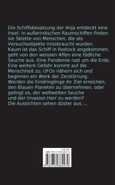 Die Schiffsbesatzung der Anja entdeckt eine Insel. In außerirdischen Raumschiffen finden sie Skelette von Menschen, die als Versuchsobjekte missbraucht wurden. Kaum ist das Schiff in Rostock angekommen, geht von den weißen Affen eine tödliche Seuche aus. Eine Pandemie rast um die Erde. Eine weitere Gefahr kommt auf die Menschheit zu. UFOs nähern sich und beginnen ein Werk der Zerstörung. Werden die Eindringlinge ihr Ziel erreichen, den Blauen Planeten zu übernehmen, oder gelingt es, der weltweiten Seuche und der Invasion Herr zu werden?