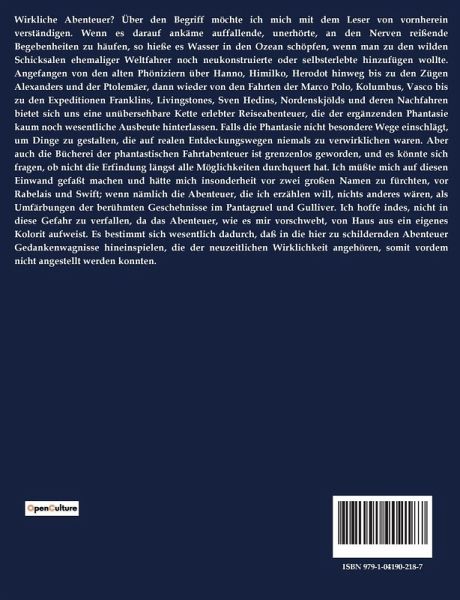 Wirkliche Abenteuer? Über den Begriff möchte ich mich mit dem Leser von vornherein verständigen. Wenn es darauf ankäme auffallende, unerhörte, an den Nerven reißende Begebenheiten zu häufen, so hieße es Wasser in den Ozean schöpfen, wenn man zu den wilden Schicksalen ehemaliger Weltfahrer noch neukonstruierte oder selbsterlebte hinzufügen wollte. Angefangen von den alten Phöniziern über Hanno, Himilko, Herodot hinweg bis zu den Zügen Alexanders und der Ptolemäer, dann wieder von den Fahrten der Marco Polo, Kolumbus, Vasco bis zu den Expeditionen Franklins, Livingstones, Sven Hedins, Nordenskjölds und deren Nachfahren bietet sich uns eine unübersehbare Kette erlebter Reiseabenteuer, die der ergänzenden Phantasie kaum noch wesentliche Ausbeute hinterlassen. Falls die Phantasie nicht besondere Wege einschlägt, um Dinge zu gestalten, die auf realen Entdeckungswegen niemals zu verwirklichen waren. Aber auch die Bücherei der phantastischen Fahrtabenteuer ist grenzenlos geworden, und es könnte sich fragen, ob nicht die Erfindung längst alle Möglichkeiten durchquert hat. Ich müßte mich auf diesen Einwand gefaßt machen und hätte mich insonderheit vor zwei großen Namen zu fürchten, vor Rabelais und Swift; wenn nämlich die Abenteuer, die ich erzählen will, nichts anderes wären, als Umfärbungen der berühmten Geschehnisse im Pantagruel und Gulliver. Ich hoffe indes, nicht in diese Gefahr zu verfallen, da das Abenteuer, wie es mir vorschwebt, von Haus aus ein eigenes Kolorit aufweist. Es bestimmt sich wesentlich dadurch, daß in die hier zu schildernden Abenteuer Gedankenwagnisse hineinspielen, die der neuzeitlichen Wirklichkeit angehören, somit vordem nicht angestellt werden konnten.