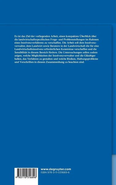 This work is intended to provide insolvency administrators, agriculturalists, and their agricultural advisors with the knowledge required to conduct an agricultural insolvency procedure. The studies also aim to show the options open to the insolvency administrator and to creditors for configuring the process, and the related risks, liability problems, and rules that need to be taken into account.