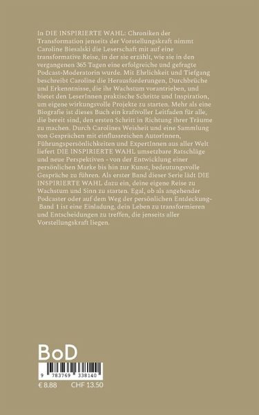 In DIE INSPIRIERTE WAHL: Chroniken der Transformation jenseits aller Vorstellungskraft nimmt Caroline Biesalski die Leserschaft mit auf eine transformative Reise, in der sie erzählt, wie sie in den vergangenen 365 Tagen eine erfolgreiche und gefragte Podcast-Moderatorin wurde. Mit Ehrlichkeit und Tiefgang beschreibt Caroline die Herausforderungen, Durchbrüche und Erkenntnisse, die ihr Wachstum vorantrieben, und bietet den LeserInnen praktische Schritte und Inspiration, um ihre eigenen wirkungsvollen Projekte zu starten. Mehr als eine Biografie ist dieses Buch ein kraftvoller Leitfaden für alle, die bereit sind, den ersten Schritt in Richtung ihrer Träume zu machen. Durch Carolines Weisheiten und eine Sammlung von Gesprächen mit einflussreichen AutorInnen, Führungspersönlichkeiten und ExpertInnen aus aller Welt liefert DIE INSPIRIERTE WAHL umsetzbare Ratschläge und neue Perspektiven - von der Entwicklung einer persönlichen Marke bis hin zur Kunst, bedeutungsvolle Gespräche zu führen. Als erster Band dieser Serie lädt DIE INSPIRIERTE WAHL die Leserschaft ein, ihre eigene Reise zu Wachstum und Sinn zu beginnen. Egal, ob angehender Podcaster oder auf dem Weg der persönlichen Entdeckung - Band 1 ist eine Einladung, das Leben zu transformieren und Entscheidungen zu treffen, die jenseits der Vorstellungskraft liegen.