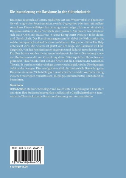 Rassismus zeigt sich auf unterschiedlichste Art und Weise: verbal, in physischer Gewalt, ungleicher Repräsentation, sozialer Segregation oder institutionellem Ausschluss. Diese vielfältigen Erscheinungsformen zeigen, dass es verkürzt wäre, Rassismus auf individuelle Vorurteile zu reduzieren. Aus diesem Grund befasst sich diese Arbeit mit Rassismus in seiner Komplexität zwischen Individuum und Gesellschaft. Der Forschungsgegenstand ist dabei die Kulturindustrie, welche exemplarisch anhand des 2011 erschienenen Hollywood-Films The Help untersucht wird. Die Analyse ist gleitet von der Frage, wie Rassismus im Film dargestellt, von den Rezipient:innen angeeignet und dadurch reproduziert wird. Darüber hinaus werden die internen Widersprüche dieser Darstellung sowie die Mechanismen, die zur Verdeckung dieser Widersprüche führen, herausgearbeitet. Theoretisch stützt sich die Arbeit auf die Einsichten der Kritischen Theorie. Es werden sozialpsychologische sowie ideologiekritische Überlegungen aufeinander bezogen. Dies ermöglicht es, die kulturindustrielle Darstellung von Rassismus in seiner Vielschichtigkeit zu untersuchen und die Wechselwirkung zwischen materiellen Verhältnissen, Ideologie, Kulturindustrie und Subjekt zu betrachten.