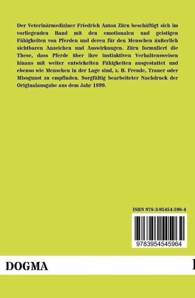Der Veterinärmediziner Friedrich Anton Zürn beschäftigt sich im vorliegenden Band mit den emotionalen und geistigen Fähigkeiten von Pferden und deren für den Menschen äußerlich sichtbaren Anzeichen und Auswirkungen. Zürn formuliert die These, dass Pferde über ihre instinktiven Verhaltensweisen hinaus mit weiter entwickelten Fähigkeiten ausgestattet und ebenso wie Menschen in der Lage sind, z. B. Freude, Trauer oder Missgunst zu empfinden. Sorgfältig bearbeiteter Nachdruck der Originalausgabe aus dem Jahr 1899.