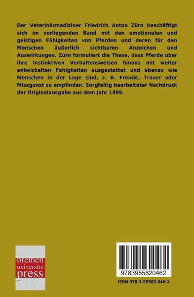 Der Veterinärmediziner Friedrich Anton Zürn beschäftigt sich im vorliegenden Band mit den emotionalen und geistigen Fähigkeiten von Pferden und deren für den Menschen äußerlich sichtbaren Anzeichen und Auswirkungen. Zürn formuliert die These, dass Pferde über ihre instinktiven Verhaltensweisen hinaus mit weiter entwickelten Fähigkeiten ausgestattet und ebenso wie Menschen in der Lage sind, z. B. Freude, Trauer oder Missgunst zu empfinden. Sorgfältig bearbeiteter Nachdruck der Originalausgabe aus dem Jahr 1899.