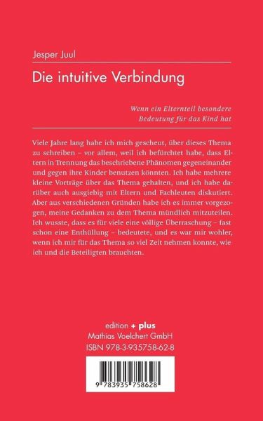 Die intuitive Verbindung entfaltet ihre volle konstruktive Macht in dem Moment, in dem sowohl das entsprechende Elternteil als auch das Kind ihre Existenz anerkennen ¿ vor allem dann, wenn das andere Elternteil in der Lage ist, diese Verbindung zu unterstützen. Viele Jahre lang habe ich mich gescheut, über dieses Thema zu schreiben ¿ vor allem, weil ich befürchtet habe, dass Eltern in Trennung das beschriebene Phänomen gegeneinander und gegen ihre Kinder benutzen könnten. Ich habe mehrere kleine Vorträge über das Thema gehalten, und ich habe darüber auch ausgiebig mit Eltern und Fachleuten diskutiert. Aber aus verschiedenen Gründen habe ich es immer vorgezogen, meine Gedanken zu dem Thema mündlich mitzuteilen. Ich wusste, dass es für viele eine völlige Überraschung ¿ fast schon eine Enthüllung ¿ bedeutete, und es war mir wohler, wenn ich mir für das Thema so viel Zeit nehmen konnte, wie ich und die Beteiligten brauchten. Jesper Juul