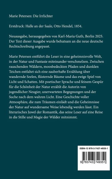 Marie Petersen: Die Irrlichter. Eine Nacht am Unkenteich Marie Petersen entführt die Leser in eine geheimnisvolle Welt, in der Natur und Fantasie miteinander verschmelzen. Zwischen rauschenden Wäldern, moosbedeckten Pfaden und dunklen Teichen entfaltet sich eine zauberhafte Erzählung über wandernde Seelen, flüsternde Bäume und das ewige Spiel von Licht und Schatten. Mit poetischer Sprache und feinem Gespür für die Schönheit der Natur erzählt die Autorin von jugendlicher Neugier, unerwarteten Begegnungen und der Suche nach dem wahren Licht. Eine Geschichte voller Atmosphäre, die zum Träumen einlädt und die Geheimnisse der Natur auf wundersame Weise lebendig werden lässt. Ein literarisches Juwel der Romantik, das seine Leser auf eine Reise in die Stille und Magie der Wälder mitnimmt. Erstdruck: Halle an der Saale, Otto Hendel, 1854. Neuausgabe, herausgegeben von Karl-Maria Guth, Berlin 2025. Der Text dieser Ausgabe wurde behutsam an die neue deutsche Rechtschreibungangepasst. Gesetzt aus der Minion Pro, 11 pt. Henricus - Edition Deutsche Klassik GmbH