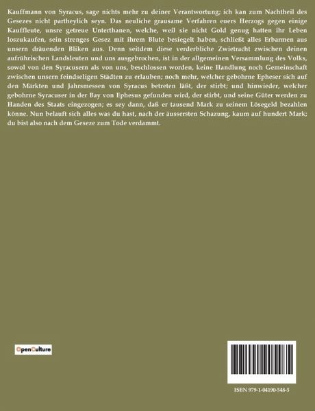 Kauffmann von Syracus, sage nichts mehr zu deiner Verantwortung; ich kan zum Nachtheil des Gesezes nicht partheylich seyn. Das neuliche grausame Verfahren euers Herzogs gegen einige Kauffleute, unsre getreue Unterthanen, welche, weil sie nicht Gold genug hatten ihr Leben loszukaufen, sein strenges Gesez mit ihrem Blute besiegelt haben, schließt alles Erbarmen aus unsern dräuenden Bliken aus. Denn seitdem diese verderbliche Zwietracht zwischen deinen aufrührischen Landsleuten und uns ausgebrochen, ist in der allgemeinen Versammlung des Volks, sowol von den Syracusern als von uns, beschlossen worden, keine Handlung noch Gemeinschaft zwischen unsern feindseligen Städten zu erlauben; noch mehr, welcher gebohrne Epheser sich auf den Märkten und Jahrsmessen von Syracus betreten läßt, der stirbt; und hinwieder, welcher gebohrne Syracuser in der Bay von Ephesus gefunden wird, der stirbt, und seine Güter werden zu Handen des Staats eingezogen; es sey dann, daß er tausend Mark zu seinem Lösegeld bezahlen könne. Nun belauft sich alles was du hast, nach der äussersten Schazung, kaum auf hundert Mark; du bist also nach dem Geseze zum Tode verdammt.