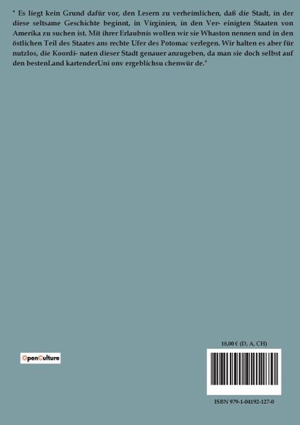 " Es liegt kein Grund dafür vor, den Lesern zu verheimlichen, daß die Stadt, in der diese seltsame Geschichte beginnt, in Virginien, in den Ver- einigten Staaten von Amerika zu suchen ist. Mit ihrer Erlaubnis wollen wir sie Whaston nennen und in den östlichen Teil des Staates ans rechte Ufer des Potomac verlegen. Wir halten es aber für nutzlos, die Koordi- naten dieser Stadt genauer anzugeben, da man sie doch selbst auf den bestenLand kartenderUni onv ergeblichsu chenwür de."