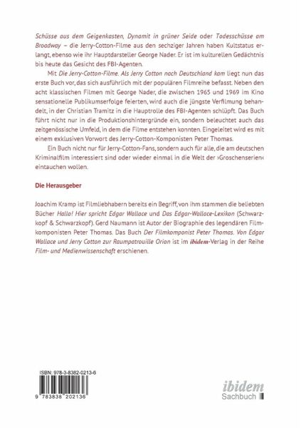Zwischen 1965 und 1969 entstanden acht Filme, die im Kino sensationelle Publikumserfolge feierten. Mit dem Band Die Jerry-Cotton-Filme. Als Jerry Cotton nach Deutschland kam legt nun das erfahrene Herausgeberteam Joachim Kramp und Gerd Naumann das erste Buch vor, das sich ausführlich mit der populären Filmreihe befasst. Neben den acht klassischen Filmen mit George Nader wird dabei auch die jüngste Verfilmung behandelt, in der Christian Tramitz in die Hauptrolle schlüpft. Kramp und Naumann führen nicht nur in die Produktionshintergründe ein, sondern beleuchten auch das zeitgenössische Umfeld, in dem die Jerry-Cotton-Filme entstehen konnten.