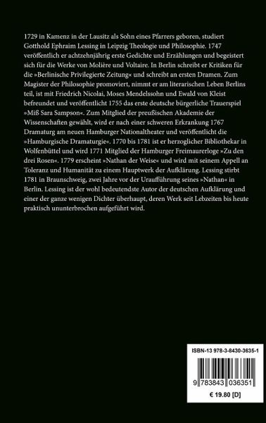 1729 in Kamenz in der Lausitz als Sohn eines Pfarrers geboren, studiert Gotthold Ephraim Lessing in Leipzig Theologie und Philosophie. 1747 veröffentlich er achtzehnjährig erste Gedichte und Erzählungen und begeistert sich für die Werke von Molière und Voltaire. In Berlin schreibt er Kritiken für die "Berlinische Privilegierte Zeitung" und schreibt an ersten Dramen. Zum Magister der Philosophie promoviert, nimmt er am literarischen Leben Berlins teil, ist mit Friedrich Nicolai, Moses Mendelssohn und Ewald von Kleist befreundet und veröffentlicht 1755 das erste deutsche bürgerliche Trauerspiel "Miß Sara Sampson". Zum Mitglied der preußischen Akademie der Wissenschaften gewählt, wird er nach einer schweren Erkrankung 1767 Dramaturg am neuen Hamburger Nationaltheater und veröffentlicht die "Hamburgische Dramaturgie". 1770 bis 1781 ist er herzoglicher Bibliothekar in Wolfenbüttel und wird 1771 Mitglied der Hamburger Freimaurerloge "Zu den drei Rosen". 1779 erscheint "Nathan der Weise" und wird mit seinem Appell an Toleranz und Humanität zu einem Hauptwerk der Aufklärung. Lessing stirbt 1781 in Braunschweig, zwei Jahre vor der Uraufführung seines "Nathan" in Berlin. Lessing ist der wohl bedeutendste Autor der deutschen Aufklärung und einer der ganze wenigen Dichter überhaupt, deren Werk seit Lebzeiten bis heute praktisch ununterbrochen aufgeführt wird.