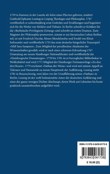 1729 in Kamenz in der Lausitz als Sohn eines Pfarrers geboren, studiert Gotthold Ephraim Lessing in Leipzig Theologie und Philosophie. 1747 veröffentlich er achtzehnjährig erste Gedichte und Erzählungen und begeistert sich für die Werke von Molière und Voltaire. In Berlin schreibt er Kritiken für die "Berlinische Privilegierte Zeitung" und schreibt an ersten Dramen. Zum Magister der Philosophie promoviert, nimmt er am literarischen Leben Berlins teil, ist mit Friedrich Nicolai, Moses Mendelssohn und Ewald von Kleist befreundet und veröffentlicht 1755 das erste deutsche bürgerliche Trauerspiel "Miß Sara Sampson". Zum Mitglied der preußischen Akademie der Wissenschaften gewählt, wird er nach einer schweren Erkrankung 1767 Dramaturg am neuen Hamburger Nationaltheater und veröffentlicht die "Hamburgische Dramaturgie". 1770 bis 1781 ist er herzoglicher Bibliothekar in Wolfenbüttel und wird 1771 Mitglied der Hamburger Freimaurerloge "Zu den drei Rosen". 1779 erscheint "Nathan der Weise" und wird mit seinem Appell an Toleranz und Humanität zu einem Hauptwerk der Aufklärung. Lessing stirbt 1781 in Braunschweig, zwei Jahre vor der Uraufführung seines "Nathan" in Berlin. Lessing ist der wohl bedeutendste Autor der deutschen Aufklärung und einer der ganze wenigen Dichter überhaupt, deren Werk seit Lebzeiten bis heute praktisch ununterbrochen aufgeführt wird.