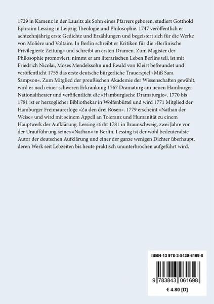 1729 in Kamenz in der Lausitz als Sohn eines Pfarrers geboren, studiert Gotthold Ephraim Lessing in Leipzig Theologie und Philosophie. 1747 veröffentlich er achtzehnjährig erste Gedichte und Erzählungen und begeistert sich für die Werke von Molière und Voltaire. In Berlin schreibt er Kritiken für die "Berlinische Privilegierte Zeitung" und schreibt an ersten Dramen. Zum Magister der Philosophie promoviert, nimmt er am literarischen Leben Berlins teil, ist mit Friedrich Nicolai, Moses Mendelssohn und Ewald von Kleist befreundet und veröffentlicht 1755 das erste deutsche bürgerliche Trauerspiel "Miß Sara Sampson". Zum Mitglied der preußischen Akademie der Wissenschaften gewählt, wird er nach einer schweren Erkrankung 1767 Dramaturg am neuen Hamburger Nationaltheater und veröffentlicht die "Hamburgische Dramaturgie". 1770 bis 1781 ist er herzoglicher Bibliothekar in Wolfenbüttel und wird 1771 Mitglied der Hamburger Freimaurerloge "Zu den drei Rosen". 1779 erscheint "Nathan der Weise" und wird mit seinem Appell an Toleranz und Humanität zu einem Hauptwerk der Aufklärung. Lessing stirbt 1781 in Braunschweig, zwei Jahre vor der Uraufführung seines "Nathan" in Berlin. Lessing ist der wohl bedeutendste Autor der deutschen Aufklärung und einer der ganze wenigen Dichter überhaupt, deren Werk seit Lebzeiten bis heute praktisch ununterbrochen aufgeführt wird.