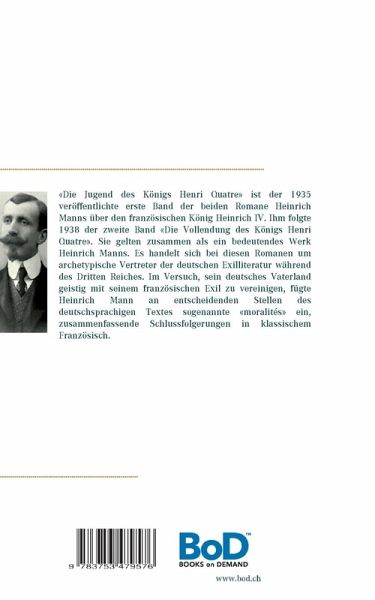 «Die Jugend des Königs Henri Quatre» ist der 1935 veröffentlichte erste Band der beiden Romane Heinrich Manns über den französischen König Heinrich IV. Ihm folgte 1938 der zweite Band «Die Vollendung des Königs Henri Quatre». Sie gelten zusammen als ein bedeutendes Werk Heinrich Manns. Es handelt sich bei diesen Romanen um archetypische Vertreter der deutschen Exilliteratur während des Dritten Reiches. Im Versuch, sein deutsches Vaterland geistig mit seinem französischen Exil zu vereinigen, fügte Heinrich Mann an entscheidenden Stellen des deutschsprachigen Textes sogenannte «moralités» ein,…mehr
