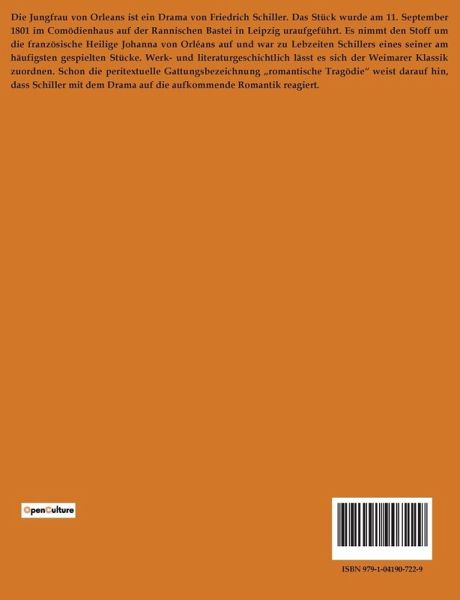 "Die Jungfrau von Orleans" ist ein dramatisches Werk von Friedrich Schiller, das die Geschichte von Johanna d'Arc, der legendären französischen Heldin, erzählt. Die Handlung beginnt im königlichen Lager von König Karl VII. von Frankreich, der von inneren und äußeren Konflikten geplagt wird. Frankreich ist durch den Hundertjährigen Krieg zerrissen, und der englische Feind bedroht die Stadt Orleans. Inmitten dieser Krise erscheint Johanna, eine einfache Hirtenmädchen, die behauptet, von Gott gesandt zu sein, um Frankreich zu retten. Sie überzeugt den König von ihrer göttlichen Mission, indem sie ihm die geheimen Gebete offenbart, die er in der Nacht gesprochen hat. Johanna führt die französischen Truppen mit unerschütterlichem Glauben und Mut in die Schlacht und erringt einen entscheidenden Sieg gegen die Engländer. Ihre Erscheinung und ihr unerschütterlicher Glaube inspirieren die französischen Soldaten und verbreiten Angst unter den englischen Truppen. Trotz ihrer Erfolge wird Johanna von inneren Zweifeln und äußeren Feinden geplagt. Die Tragödie entfaltet sich, als Johanna schließlich von den eigenen Leuten missverstanden und verraten wird, was zu ihrem tragischen Ende führt. Schillers Werk thematisiert die Konflikte zwischen persönlichem Glauben, politischer Macht und Schicksal. Es beleuchtet die Rolle des Individuums in der Geschichte und die Grenzen menschlicher Kontrolle über das eigene Schicksal. Die Tragödie endet mit einem Gefühl der Erhabenheit und des Mysteriums, das Johannas Leben und Tod umgibt.