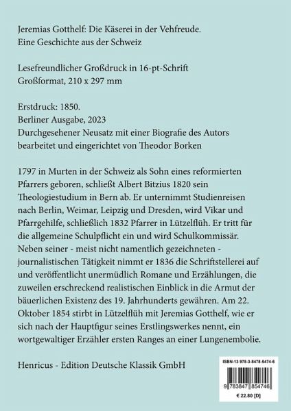 Jeremias Gotthelf: Die Käserei in der Vehfreude. Eine Geschichte aus der SchweizLesefreundlicher Großdruck in 16-pt-SchriftGroßformat, 210 x 297 mmBerliner Ausgabe, 2023Durchgesehener Neusatz mit einer Biografie des Autors bearbeitet und eingerichtet von Theodor BorkenErstdruck: 1850.Umschlagabbildung: Childe Hassam, Der Milchladen, 1888Gesetzt aus der Minion Pro, 16 pt.Henricus - Edition Deutsche Klassik GmbHÜber den Autor:1797 in Murten in der Schweiz als Sohn eines reformierten Pfarrers geboren, schließt Albert Bitzius 1820 sein Theologiestudium in Bern ab. Er unternimmt Studienreisen nach Berlin, Weimar, Leipzig und Dresden, wird Vikar und Pfarrgehilfe, schließlich 1832 Pfarrer in Lützelflüh. Er tritt für die allgemeine Schulpflicht ein und wird Schulkommissär. Neben seiner - meist nicht namentlich gezeichneten - journalistischen Tätigkeit nimmt er 1836 die Schriftstellerei auf und veröffentlicht unermüdlich Romane und Erzählungen, die zuweilen erschreckend realistischen Einblick in die Armut der bäuerlichen Existenz des 19. Jahrhunderts gewähren. Am 22. Oktober 1854 stirbt in Lützelflüh mit Jeremias Gotthelf, wie er sich nach der Hauptfigur seines Erstlingswerkes nennt, ein wortgewaltiger Erzähler ersten Ranges an einer Lungenembolie.
