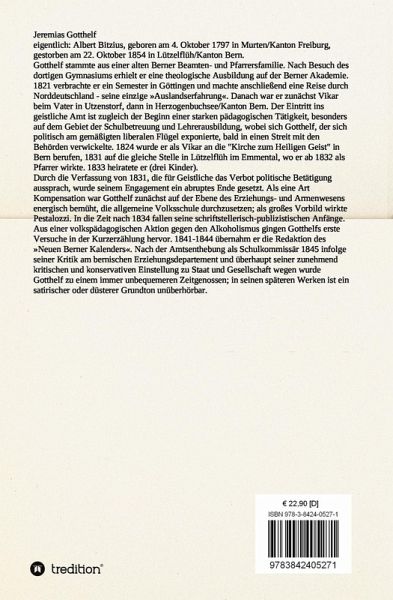 Jeremias Gotthelf (d.i. Albert Bitzius), 4.10.1797 Murten, Kanton Fribourg - 22.10.1854 Lützelflüh, Kanton Bern stammte aus einem Pfarrhaus, besuchte das Gymnasium in Bern (1812-14) und studierte anschließend bis 1820 Theologie an der Berner Akademie. Er unterbrach seine Vikariatszeit bei seinem Vater in Utzenstorf, Oberaargau, durch einen Studienaufenthalt in Göttingen und eine Reise durch den Norden Deutschlands (1821-22). Danach war er wieder Vikar in Utzenstorf; nach dem Tod seines Vaters wurde er 1824 nach Herzogenbuchsee, 1829 nach Bern und 1831 nach Lützelflüh im Emmental versetzt; hier erhielt er 1832 eine Pfarrstelle. Sein politisches Engagement für den Liberalismus fand mit der Verfassung von 1831 ein Ende; sie verbot Geistlichen die politische Betätigung. Stattdessen trat er in der Nachfolge J. H. Pestalozzis und der Schweizer Volksaufklärung für die Verbesserung des Erziehungswesens und der sozialen Verhältnisse ein; seine Kritik an der Berner Erziehungspolitik trug ih