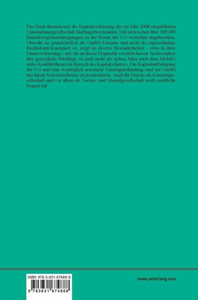 Das Buch thematisiert die Kapitalverfassung der im Jahr 2008 eingeführten Unternehmergesellschaft (haftungsbeschränkt). Mit inzwischen über 100.000 Handelsregistereintragungen ist der Boom der UG weiterhin ungebrochen. Obwohl sie grundsätzlich als GmbH-Variante und nicht als eigenständige Rechtsform konzipiert ist, zeigt sie diverse Besonderheiten - etwa in ihrer Finanzverfassung - auf, die an dieser Dogmatik zweifeln lassen. Insbesondere ihre gesetzliche Rücklage ist auch mehr als sieben Jahre nach dem MoMiG stetes Konfliktthema im Bereich des Kapitalschutzes. Die Kapitalaufbringung der UG und eine womöglich erweiterte Vermögensbindung sind zur GmbH mit ihrem Seriositätsbonus zu positionieren. Auch ihr Einsatz als Konzerngesellschaft und vor allem als Vorrats- und Mantelgesellschaft wirft rechtliche Fragen auf.