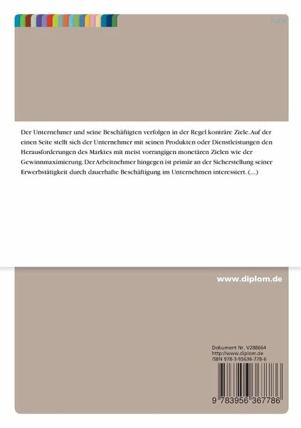Bachelorarbeit aus dem Jahr 2015 im Fachbereich Jura - Zivilrecht / Arbeitsrecht, Note: 1,3, FOM Essen, Hochschule für Oekonomie & Management gemeinnützige GmbH, Hochschulleitung Essen früher Fachhochschule (Studienzentrum Duisburg), Sprache: Deutsch, Abstract: Der Unternehmer und seine Beschäftigten verfolgen in der Regel konträre Ziele. Auf der einen Seite stellt sich der Unternehmer mit seinen Produkten oder Dienstleistungen den Herausforderungen des Marktes mit meist vorrangigen monetären Zielen wie der Gewinnmaximierung. Der Arbeitnehmer hingegen ist primär an der Sicherstellung seiner Erwerbstätigkeit durch dauerhafte Beschäftigung im Unternehmen interessiert.