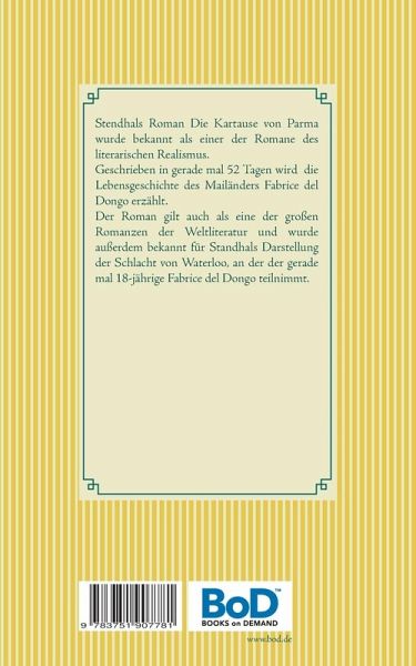 Die Kartause von Parma von Stendhal wurde bekannt als einer der Romane des literarischen Realismus.Geschrieben in gerade mal 52 Tagen erzählt er die Lebensgeschichte des Mailänder Fabrice del Dongo. Der Roman gilt als eine der großen Romanzen der Weltliteratur und wurde außerdem bekannt für Standhals Darstellung der Schlacht von Waterloo, an der Fabrice delDongo als gerade mal 18-jähriger teilnimmt.
