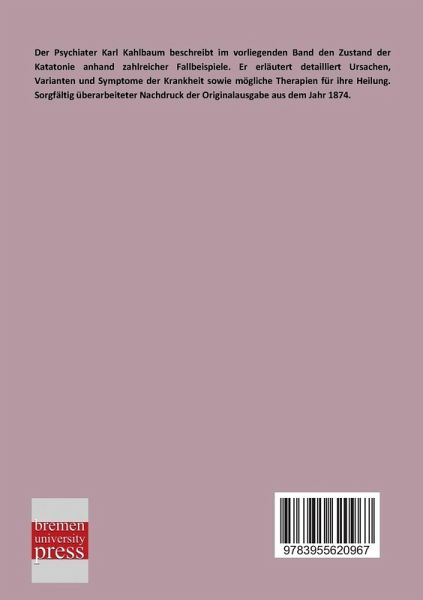 Der Psychiater Karl Kahlbaum beschreibt im vorliegenden Band den Zustand der Katatonie anhand zahlreicher Fallbeispiele. Er erläutert detailliert Ursachen, Varianten und Symptome der Krankheit sowie mögliche Therapien für ihre Heilung. Sorgfältig überarbeiteter Nachdruck der Originalausgabe aus dem Jahr 1874.