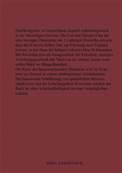 Nachkriegszeit in Deutschland, doppelt entbehrungsreich in der ehemaligen Ostzone. Mit List und Zähigkeit hat die stets besorgte Übermutter der 12-jährigen Roswitha erreicht, dass das Kind ein halbes Jahr zur Erholung nach England kommt, in das Haus der ledigen Lehrerin Miss M. Maunders. Mit Roswitha reist als Gastgeschenk die Keksdose, einstiges Verlobungsgeschenk des Vaters an die Mutter, letztes wertvolles Stück im Mangelhaushalt. Die Reise des heranwachsenden Mädchens wird im Kontrast zur Heimat zu einem eindringlichen Zeitdokument. Die humorvolle Schilderung von sprachlichen Missverständnissen und die Unbefangenheit Roswithas machen das Buch bei aller Schicksalhaftigkeit zu einer vergnüglichen Lektüre.
