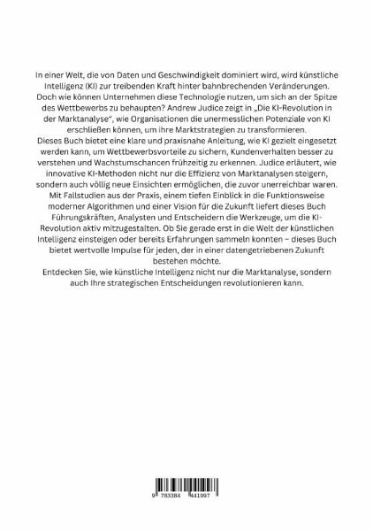 In einer Welt, die von Daten und Geschwindigkeit dominiert wird, wird künstliche Intelligenz (KI) zur treibenden Kraft hinter bahnbrechenden Veränderungen. Doch wie können Unternehmen diese Technologie nutzen, um sich an der Spitze des Wettbewerbs zu behaupten? Andrew Judice zeigt in "Die KI-Revolution in der Marktanalyse", wie Organisationen die unermesslichen Potenziale von KI erschließen können, um ihre Marktstrategien zu transformieren.Dieses Buch bietet eine klare und praxisnahe Anleitung, wie KI gezielt eingesetzt werden kann, um Wettbewerbsvorteile zu sichern, Kundenverhalten besser zu verstehen und Wachstumschancen frühzeitig zu erkennen. Judice erläutert, wie innovative KI-Methoden nicht nur die Effizienz von Marktanalysen steigern, sondern auch völlig neue Einsichten ermöglichen, die zuvor unerreichbar waren.Mit Fallstudien aus der Praxis, einem tiefen Einblick in die Funktionsweise moderner Algorithmen und einer Vision für die Zukunft liefert dieses Buch Führungskräften, Analysten und Entscheidern die Werkzeuge, um die KI-Revolution aktiv mitzugestalten. Ob Sie gerade erst in die Welt der künstlichen Intelligenz einsteigen oder bereits Erfahrungen sammeln konnten - dieses Buch bietet wertvolle Impulse für jeden, der in einer datengetriebenen Zukunft bestehen möchte.Entdecken Sie, wie künstliche Intelligenz nicht nur die Marktanalyse, sondern auch Ihre strategischen Entscheidungen revolutionieren kann.