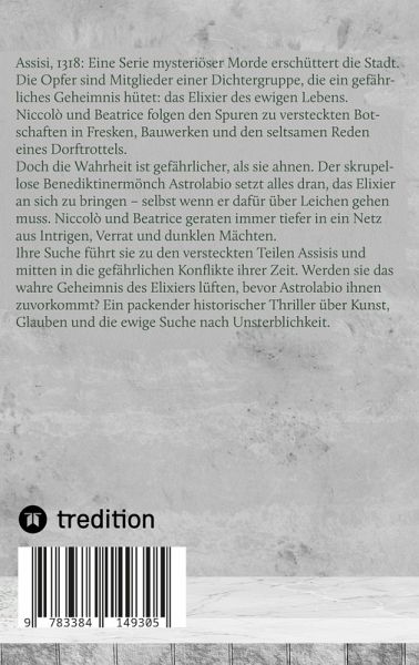 Assisi, 1318: Eine Serie mysteriöser Morde erschüttert die Stadt. Die Opfer sind Mitglieder einer Dichtergruppe, die ein gefährliches Geheimnis hütet: das Elixier des ewigen Lebens.Niccolò und Beatrice folgen den Spuren zu versteckten Botschaften in Fresken, Bauwerken und den seltsamen Reden eines Dorftrottels. Doch die Wahrheit ist gefährlicher, als sie ahnen. Der skrupellose Benediktinermönch Astrolabio setzt alles dran, das Elixier an sich zu bringen - selbst wenn er dafür über Leichen gehen muss. Niccolò und Beatrice geraten immer tiefer in ein Netz aus Intrigen, Verrat und dunklen Mächten. Ihre Suche führt sie zu den versteckten Teilen Assisis und mitten in die gefährlichen Konflikte ihrer Zeit. Werden sie das wahre Geheimnis des Elixiers lüften, bevor Astrolabio ihnen zuvorkommt? Ein packender historischer Thriller über Kunst, Glauben und die ewige Suche nach Unsterblichkeit.