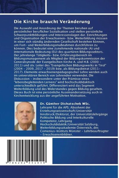 Die Auswahl und Anordnung der Themen beruhen auf persönlicher beruflicher Sozialisation und stellen persönliche Schwerpunktbildungen und Interessenslagen dar. Einrichtungen und Organisation der Erwachsenen- bzw. Weiterbildung müssen in einer sich ständig ändernden Gesellschaft bestehen können, um Fort- und Weiterbildungsmaßnahmen durchführen zu können. Dies bedeutet eine zunehmende nationale (A) und internationale Bedeutung (EU) des quartären Bildungssektors.Der jahrelange Tätigkeits- bzw. Erfahrungsbereich im Bildungsmanagement als Mitglied der Bildungskommission der Generalsynode der Evangelischen Kirche A. und H.B. (2000 - 2011) und stv. Leiter des "Evangelischen Bildungswerks in Tirol" (2004 - 2009, 2017 - 2019) bzw. als Bildungsbeirat (2011-2017). Elemente erwachsenenpädagogischer Lehre werden auch im universitären Bereich von Lehrenden verwendet. Die Diskussion - insbesondere unter der Prämisse eines "lebensbegleitenden Lernens" wird hochschuldidaktisch unterschiedlich geführt. Differenziert wird das Segment Weiterbildung und des Widerstandes gegen Bildung gesehen. Dieses Buch ist eine persönliche Auseinandersetzung auch in Kirchentwicklung aus der angeführten Motivation.