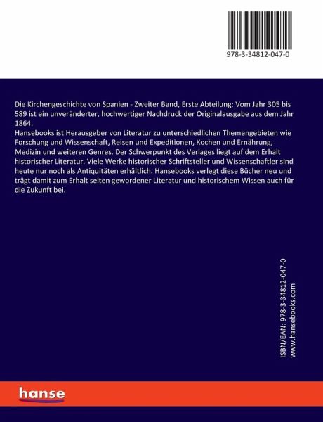 Die Kirchengeschichte von Spanien - Zweiter Band, Erste Abteilung: Vom Jahr 305 bis 589 ist ein unveränderter, hochwertiger Nachdruck der Originalausgabe aus dem Jahr 1864.Hansebooks ist Herausgeber von Literatur zu unterschiedlichen Themengebieten wie Forschung und Wissenschaft, Reisen und Expeditionen, Kochen und Ernährung, Medizin und weiteren Genres. Der Schwerpunkt des Verlages liegt auf dem Erhalt historischer Literatur. Viele Werke historischer Schriftsteller und Wissenschaftler sind heute nur noch als Antiquitäten erhältlich. Hansebooks verlegt diese Bücher neu und trägt damit zum Erhalt selten gewordener Literatur und historischem Wissen auch für die Zukunft bei.