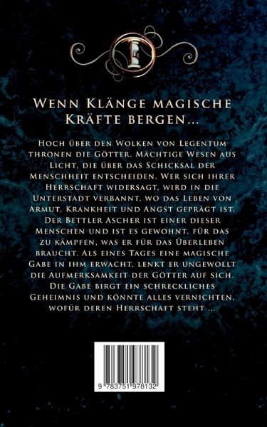 Wenn Klänge magische Kräfte bergen ...Hoch über den Wolken von Legentum thronen die Götter. Mächtige Wesen aus Licht, die über das Schicksal der Menschheit entscheiden. Wer sich ihrer Herrschaft widersagt, wird in die Unterstadt verbannt, wo das Leben von Armut, Krankheit und Angst geprägt ist. Der Bettler Ascher ist einer dieser Menschen und ist es gewohnt, für das zu kämpfen, was er für das Überleben braucht. Als eines Tages eine magische Gabe in ihm erwacht, lenkt er ungewollt die Aufmerksamkeit der Götter auf sich. Die Gabe birgt ein schreckliches Geheimnis und könnte alles vernichten, wofür deren Herrschaft steht ...