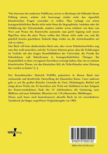 Der Kunsthistoriker Heinrich Wölfflin präsentiert in diesem Band eine umfassende und detailreiche Darstellung der klassischen Kunst. Unter anderem geht er auf die großen Künstler Lionardo da Vinci, Michelangelo, Raffael und einige deren Werke ein. Er bereichert sein Werk mit Einblicken in den Zeitgeist des Kunstverständnisses Ende des 19. Jahrhunderts, die Gesinnung, neue Bildform und neue Schönheit. Illustriert mit 110 erläuternden Abbildungen.