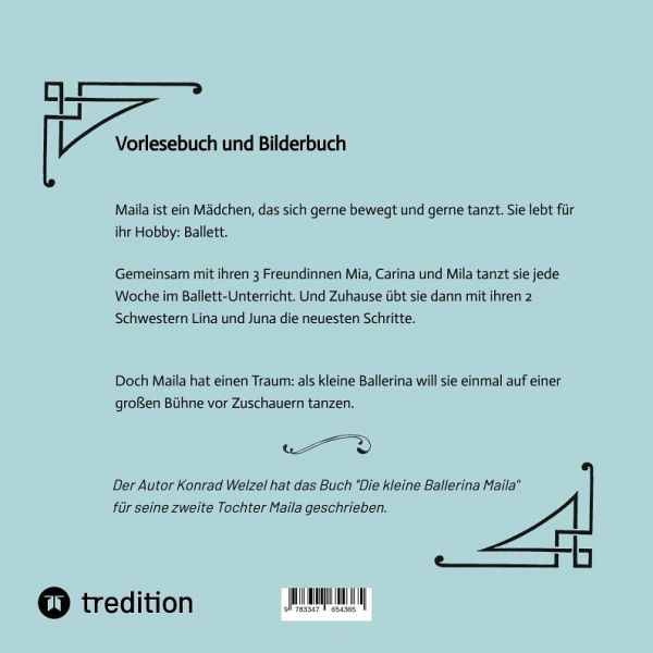 Maila ist ein Mädchen, das sich gerne bewegt und das gerne tanzt. Sie lebt für ihr Hobby: Ballett. Gemeinsam mit ihren 3 Freundinnen Mia, Carina und Mila tanzt sie jede Woche im Ballett-Unterricht. Und Zuhause übt sie dann mit ihren 2 Schwestern Lina und Juna die neuesten Schritte. Doch Maila hat einen Traum: als kleine Ballerina will sie einmal auf einer großen Bühne vor Zuschauern tanzen.Der Autor ist Konrad Welzel, der dieses Buch für seine Tochter Maila geschrieben hat.