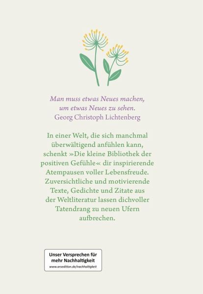 Inspirationen aus der Weltliteratur: Mit inspirierenden Texten von herausragenden Autor:innen, die das Selbstvertrauen fördernKraftquelle für den Alltag: Für die tägliche Dosis innere Stärke, um selbstbewusst und kraftvoll durch den Tag zu gehen und seinen Mitmenschen wohlwollend zu begegnenPositiv denken: Die "Kleine Bibliothek der positiven Gefühle"inspiriert dazu, die kleinen Freuden des Lebens bewusst zu genießenEin Geschenk, das die Herzen berührt: Ein wunderbares Buch für liebe Menschen, die neue Wege beschreiten, aber auch eine inspirierende kleine Aufmerksamkeit für sich selbst