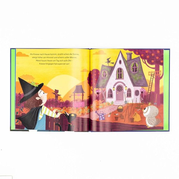 Die kleine Hexe Kresse fällt in der Zauberschule ganz schön auf: Latzhose und Gummistiefel statt Hexenhut und Umhang. Doch das ist noch nicht alles. Sie ist auch gar nicht gut darin, auf dem Besen zu fliegen, Zaubertränke zu brauen oder sich unsichtbar zu machen. Kresse ist bedrückt, kann sie doch gar nichts so gut wie die anderen Hexenschülerinnen. Doch kaum ist die Schule aus, geht Kresse in ihren Gemüsegarten und hegt und pflegt all das viele Gemüse. Hier kennt sie sich aus, hier fühlt sie sich wohl, denn offensichtlich hat sie nicht nur einen grünen Daumen, sondern in all ihren Fingern grüne Magie. Die hilft ihr dann auch dabei, die wegen fehlender Kürbisse kurz vor dem Aus stehende Halloween-Party der Schule zu retten.
