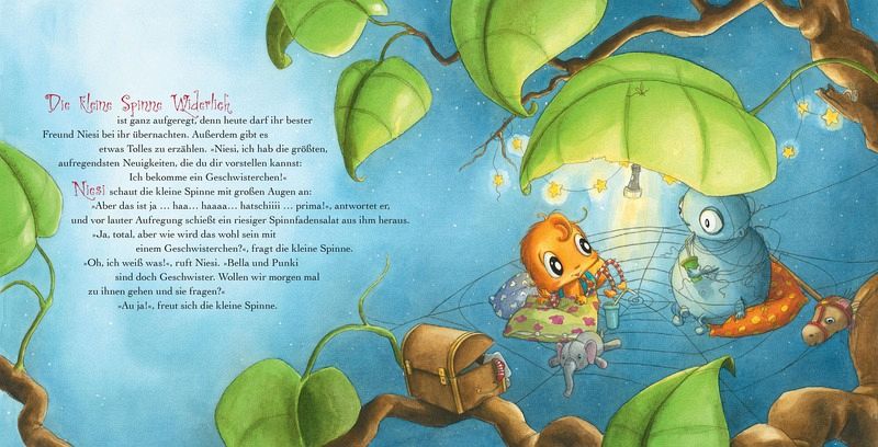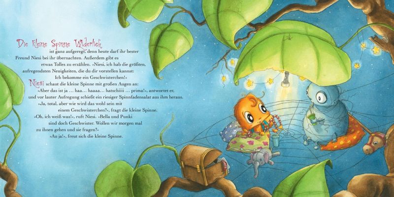 Die kleine Spinne Widerlich bekommt ein Geschwisterchen. Was für ein aufregendes Erlebnis! Aber wie ist das wohl so mit einem Baby? Gemeinsam mit ihren Freunden macht sich die kleine Spinne auf den Weg, um bei den Tierbabys im Wald eine Antwort zu finden. Sie beobachten die Kaulquappen im Teich, treffen auf Füchse, Eichhörnchen und so manch anderen Waldbewohner. Dabei erfährt die kleine Spinne vieles, was ihre Freude über das neue Familienmitglied noch größer werden lässt.