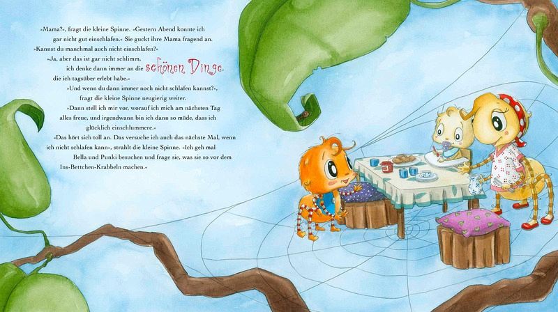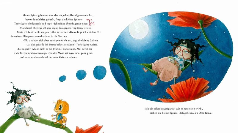 Die Figuren sind liebevoll und humorvoll gestaltet: von der herzlichen Spinnenfamilie bis zu den Freunden mit ihren Eigenheiten. Niesi mit seinem chaotischen „Spinnenfadensalat“ ist ein Highlight, genauso wie Tante Igitte, deren Name allein schon ein Schmunzeln wert ist. Schön ist auch, dass die Rituale im Text nochmals in Rot und in „Spinnenschrift“ hervorgehoben sind. Wir begleiten die kleine Spinne auf ihrem Weg von Freund zu Freund, erleben die unterschiedlichsten Rituale und staunen gemeinsam mit ihr. Am Ende macht sie das Erfahrene mit Mini-Spinni nach – und schläft, liebevoll ins Bett gebracht von Mama Spinne, zufrieden ein. Tolle Freunde, eine liebevolle Familie und ein wunderschönes Geschwister-Miteinander – dieses Buch ist einfach Herz pur!