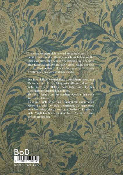 In diesen Kurzgeschichten wird unter anderem erzählt, warum der Mond nun Ohren haben wollte, über eine zu Herzen gehende Begegnung im Park, über eine Kindheitserinnerung, über einen Kater, der sich in ein Gardinenband einwickelte, oder es wird von Erzählungen aus alten Zeiten berichtet. Das Buch hält 20 verschiedene Geschichten bereit, um Menschen aus ihrem Alltag zu entführen, damit sie sich nach der Hektik des Tages mit kleinen Geschichten zurückziehen können. Sie sollen Freude und Ruhe geben, oder die Zeit beim Warten verkürzen. Es könnte auch ein kleines Geschenk für einen lieben Menschen sein. Ob zum Geburtstag, zu Feiertagen, zum Muttertag oder zu sonstigen Anlässen. Es gibt so viele Möglichkeiten, einem anderen Menschen eine Freude zu machen.