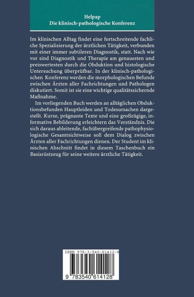 Der besonderen Bedeutung der medizinischen Qualitätssicherung durch die Obduktion im Rahmen der internen ärztlichen, aber auch öffentlichen Diskussion wird in diesem Buch Rechnung getragen. Dabei werden die gewöhnlichen Hauptleiden und Todesursachen, wie Erkrankungen des Herz-Kreislauf-Systems, des Gastrointestinal- und Respirationstrakts sowie des Urogenitalsystems dargestellt, mit Schwerpunkt auf der Makroskopie, nicht der Mikroskopie. Kurze, prägnante Texte und eine großzügige, informative Bebilderung fördern ein genaueres Verständnis der Alltagspathologie. Mit diesem Taschenbuch erhalten niedergelassene und Krankenhausärzte einen kurzen, verständlichen Leitfaden als Diskussionsgrundlage für die klinisch-pathologische Konferenz.