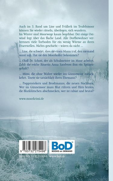 Auch im 3. Band um Line und Früllerk im Teufelsmoor können Sie wieder rätseln, überlegen, sich wundern. Im Winter sind Moorwege kaum begehbar. Der eisige Ostwind fegt über das flache Land. Alle Dorfbewohner verbrennen viele Torfsoden für ein wenig Wärme an ihren Feuerstellen. Nichts geschieht - wären da nicht ... ... Line, die schwört, dass sie einen Mann traf, den niemand sonst sah. Hat sie den Moorkoller bekommen?... Oloff Dr. Schott, der als Schulmeister im Moor arbeitet. Zahlt die reiche Bäuerin Anna Sandvoss ihm ein Spitzengehalt? ... Mimi, die ohne Walter wieder ins Günnemoor zurückkehrt. Tötete sie tatsächlich ihren Ehemann?... Poggenstekers und Brodtmanns, die neuen Nachbarn. Wer im Günnemoor muss Blut rühren und Hirn braten, die Blutklütschen abschmecken, wer ist rabiat und brutal?www.moorkrimi.de