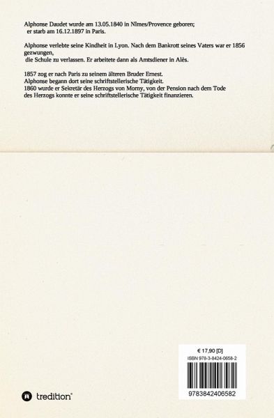 Alphonse Daudet wurde am 13.05.1840 in Nîmes/Provence geboren; er starb am 16.12.1897 in Paris.Alphonse verlebte seine Kindheit in Lyon. Nach dem Bankrott seines Vaters war er 1856 gezwungen, die Schule zu verlassen. Er arbeitete dann als Amtsdiener in Alès.1857 zog er nach Paris zu seinem älteren Bruder Ernest. Alphonse begann dort seine schriftstellerische Tätigkeit. 1860 wurde er Sekretär des Herzogs von Morny, von der Pension nach dem Tode des Herzogs konnte er seine schriftstellerische Tätigkeit finanzieren.