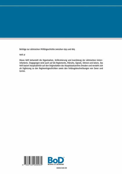 Dieses Heft behandelt die Organisation, Uniformierung und Ausrüstung der sächsischen Linien-Infanterie. Eingegangen wird auch auf die Reglements, Märsche, Signale, Fahnen und Jalons. Das Heft basiert hauptsächlich auf den Originalakten des Hauptstaatsarchivs Dresden und versteht sich als Ergänzung zu den Regimentsgeschichten sowie den Feldzugsbeschreibungen von Exner und Cerrini.