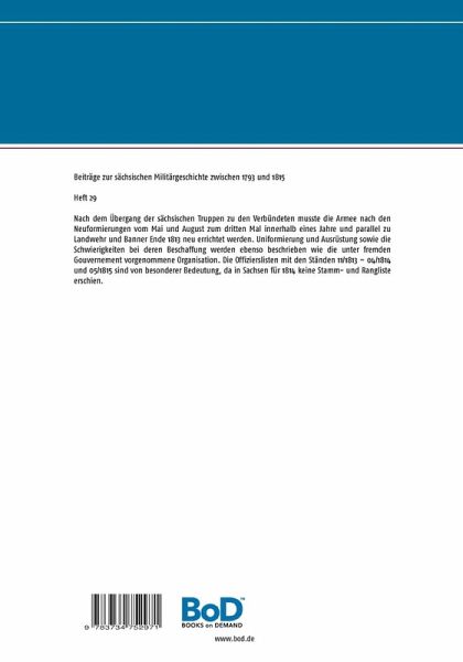 Beiträge zur sächsischen Militärgeschichte zwischen 1793 und 1815Heft 29 Nach dem Übergang der sächsischen Truppen zu den Verbündeten musste die Armee nach den Neuformierungen vom Mai und August zum dritten Mal innerhalb eines Jahre und parallel zu Landwehr und Banner Ende 1813 neu errichtet werden. Uniformierung und Ausrüstung sowie die Schwierigkeiten bei deren Beschaffung werden ebenso beschrieben wie die unter fremden Gouvernement vorgenommene Organisation. Die Offizierslisten mit den Ständen 11/1813 - 04/1814 und 05/1815 sind von besonderer Bedeutung, da in Sachsen für 1814 keine Stamm- und Rangliste erschien.