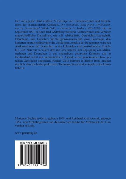 Der vorliegende Band umfasst 22 Beiträge von Teilnehmerinnen und Teilnehmern der internationalen Konferenz Die (koloniale) Begegnung. AfrikanerInnen in Deutschland (1880-1945) - Deutsche in Afrika (1880-1918), die im September 2001 in Bonn-Bad Godesberg stattfand. Vertreterinnen und Vertreter unterschiedlicher Disziplinen, wie z.B. Afrikanistik, Geschichtswissenschaft, Ethnologie, Jura, Literatur- und Religionswissenschaft sowie Soziologie, diskutierten interdisziplinär über die vielfältigen Aspekte der Begegnung zwischen AfrikanerInnen und Deutschen in der kolonialen und postkolonialen Epoche bis 1945. Neu war vor allem, dass die Geschichte(n) der Begegnung von AfrikanerInnen und Deutschen in den ehemaligen deutschen Kolonien und in Deutschland selbst als unterschiedliche Aspekte einer gemeinsamen bzw. geteilten Geschichte angesehen wurden. Viele Beiträge in diesem Band machen deutlich, dass die bisher praktizierte Trennung dieser beiden Aspekte eine künstliche ist.